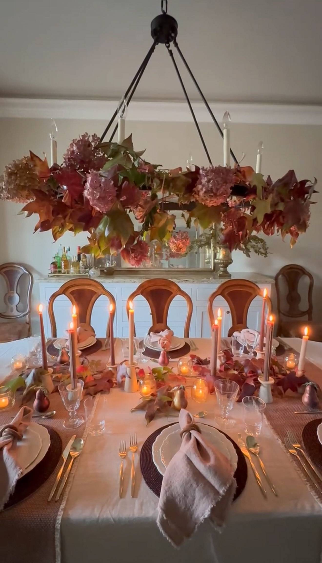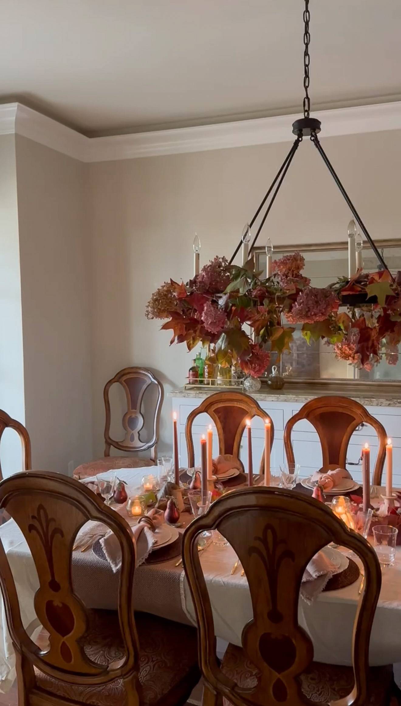 I’m keeping the palette simple and subdued; cream and varying shades of plum and rounding it out with some bronze and as always, well layered. This year, my mom’s garden was still flush with hydrangeas and greenery, so I encircled the chandelier with fresh blooms and foliage. I had some concern that it was installed a bit too early, but as it has begun to dry, it’s taking on the most elegant shape—proof that dried botanicals can be every bit as beautiful as fresh.