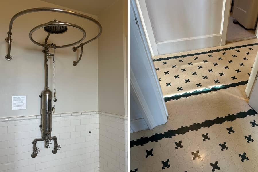 The rooms vary in form and influence, but the round Turkish smoking room with its Moorish detailing was especially memorable. In the staff kitchen, a black-and-white rubber puzzle-piece floor caught my attention—practical, yes, but unexpectedly charming. The showers, too, were thoughtfully designed: multi-functioning circular pipe fixtures with the tanks mounted decoratively on the exterior walls. It’s always interesting to see how luxury was interpreted through the lens of early 20th-century innovation.