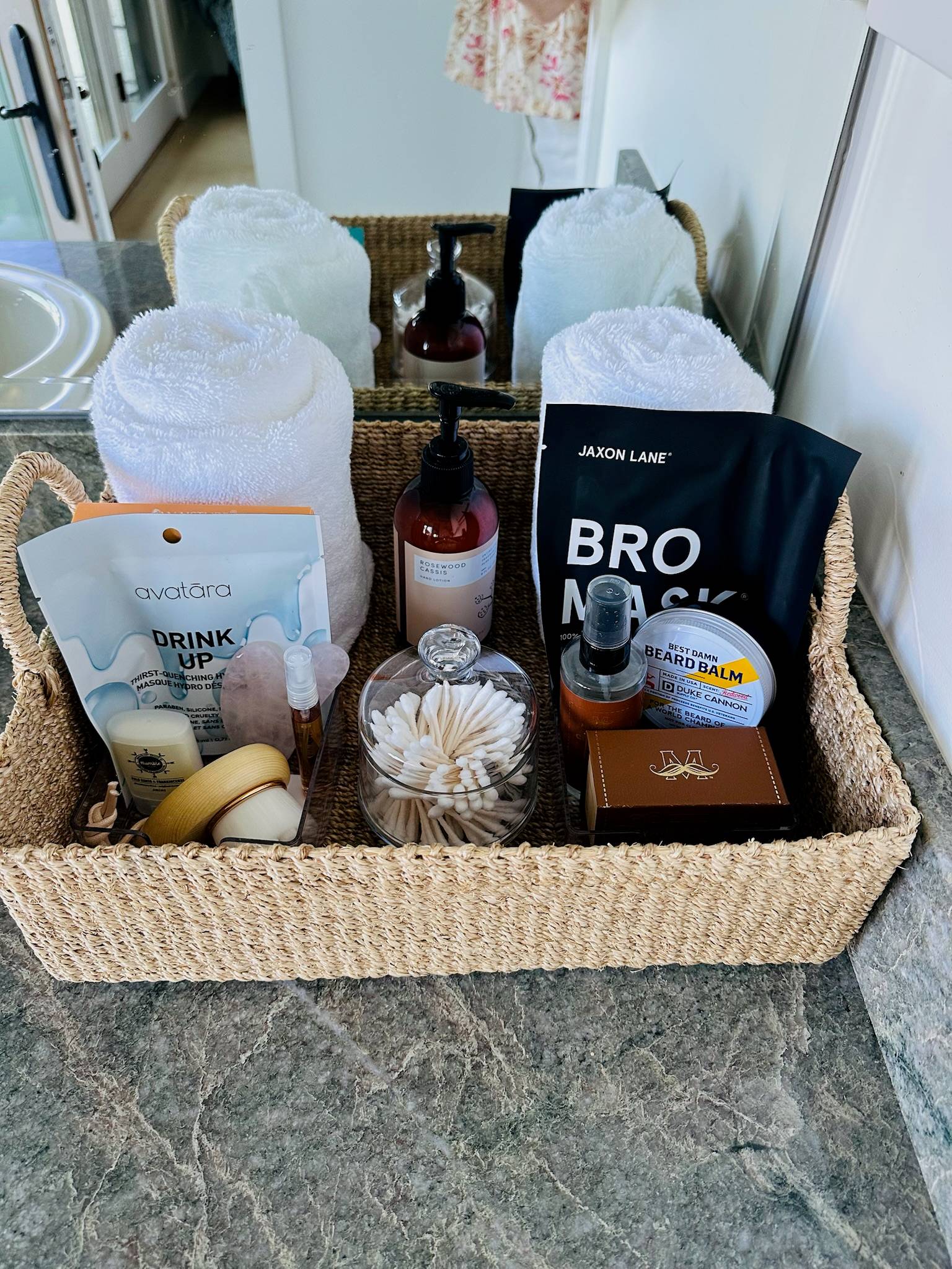 This month, I personalized the welcome sign with our guests’ last name (“The Irving Suite”), stocked the outdoor fridge with sparkling water and fruit, and added a few fun extras to the toiletry baskets (like a gua sha and mini cologne).